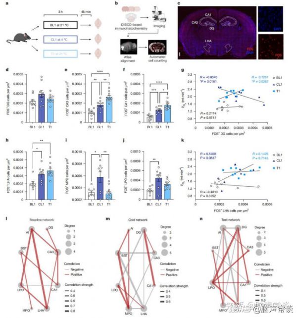 为了识别与寒冷记忆编码和提取相关的神经活动模式,检测了多个脑区的FOS表达。作者比较了BL1(基线第1天)、CL1(寒冷第1天)和T1(测试第1天)期间的FOS活性,以确定在特定条件下哪些区域处于活跃状态。为了实现对海马和下丘脑各区域的自动化FOS检测,所有大脑样本均通过一个自动化的全脑计数流程进行分析。结果显示,在三种条件下,齿状回(DG)中的FOS+细胞数量没有显著差异。然而,与BL1相比,在CL1和T1时,CA3和CA1亚区中发现了冷激活的FOS活性,这表明CA3和CA1是参与寒冷反应的重要区域。尽管在三种条件下DG的FOS活性未发现先天性差异,但假设该区域在学习后可能通过与全身代谢的交互作用而发生变化。因此,将DG的FOS活性与BL1、CL1和T1时的氧气消耗进行了相关性分析。结果表明,在BL1时,DG的FOS活性与代谢率之间无相关性;在CL1时,氧气消耗与DG活性呈负相关;而在T1时,当寒冷记忆巩固后,二者之间出现了显著的正相关。类似的关联模式在CA1中也被观察到,但在CA3中未发现。海马的不同亚区参与了情境性寒冷记忆的编码或提取,且DG和CA1在T1时对调节全身代谢起到了一定作用。先前的研究已将外侧下丘脑区(LHA)、内侧视前区(MPO)和外侧视前区(LPO)确定为参与体温调节的关键脑区。因此,比较了这些区域在BL1、CL1和T1时的FOS活性。发现当小鼠在CL1暴露于寒冷环境时,LHA的FOS活性上调。当小鼠在T1回忆寒冷时,该区域也表现出相似的活性水平。虽然作者在寒冷暴露期间也观察到MPO和LPO的活性增加,但在T1时这些区域的FOS活性并未增加。此外,在其他被研究的下丘脑区域中,无论是CL1还是T1,均未发现FOS活性的增加。接下来,测试了LHA、MPO和LPO的活性是否与代谢率相关。发现只有在CL1暴露于寒冷的小鼠中,LHA的FOS活性与氧气消耗之间存在正相关趋势。这种趋势在任何其他条件或其他下丘脑区域中均未出现。这些发现表明,LHA在寒冷的编码和回忆过程中起重要作用,且其活性在寒冷经历期间与代谢率相关。最后对小鼠进行了恐惧条件反射实验,接受情境恐惧条件反射训练的小鼠在海马和下丘脑区域未表现出与寒冷实验中类似的FOS活性增加。此外,恐惧条件反射后,杏仁核区域的FOS活性增加,但在寒冷暴露或寒冷回忆期间未观察到类似现象。这些数据表明,海马和下丘脑中观察到的神经活动并非由压力引起。为了理解在寒冷暴露和寒冷记忆提取期间脑区之间的功能连接如何改变,进一步对不同脑区的FOS活性进行了相关性分析。发现与基线网络相比,当小鼠暴露于寒冷时,下丘脑区域之间的功能连接增强。此外,当小鼠回忆寒冷时,海马与下丘脑之间的功能连接比经历寒冷时更强,而这种现象在基线网络中未观察到。这些数据表明,从海马到下丘脑的功能连接是一种可塑性特征,是在小鼠编码寒冷情境记忆后形成的。