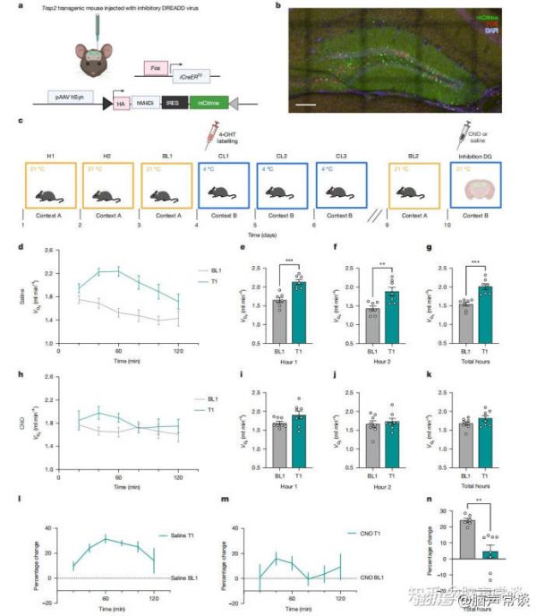 为了进一步探索冷敏感记忆痕迹细胞的作用,作者在寒冷记忆提取期间通过化学遗传学方法抑制了DG中的冷记忆痕迹细胞。为此,在CL1时用化学遗传学地抑制这些细胞,观察到在T1时向对照组小鼠注射生理盐水后,其代谢率相较于BL1有所增加,这种代谢率的增加在整个2小时测试期间以及总测试时间内均存在。相比之下,作者发现接受CNO处理的小鼠在T1时不再表现出学习到的代谢率增加。此外,发现在整个测试期间的任何时间点,条件性反应都消失了。当直接比较注射生理盐水和注射CNO的小鼠时,发现注射生理盐水的小鼠比注射CNO的小鼠表现出显著更高的代谢变化百分比。综上所述,通过抑制DG中的冷敏感细胞,可以抑制情境性寒冷记忆,从而阻止与这些情境刺激相关的条件性全身反应。
