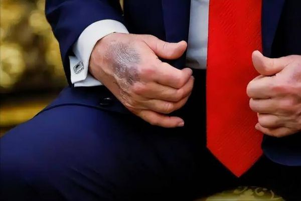 最近特朗普露面时,被拍到右手背有明显的皮下淤血,脚踝也有些肿胀。