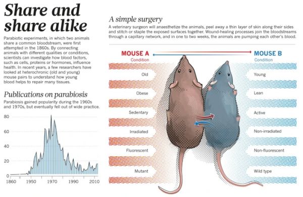1956 年,纽约伊萨卡康奈尔大学的生物化学家和老年病学家 Clive McCay 做了一个有点可怕的「联体共生」实验。他们将不同年龄段的老鼠,通过外科手术使它们的脉管系统结合在一起,共用一个循环系统。
