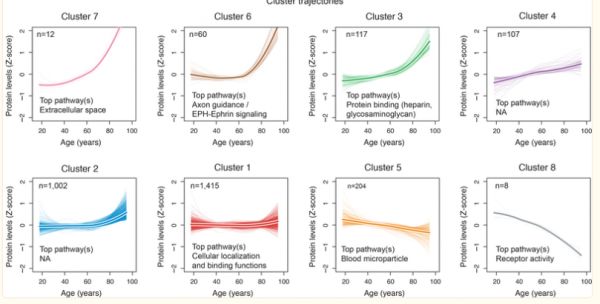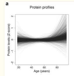研究选取了年龄范围涵盖 18~95 岁的 4263 名被试者,从他们的血液中提取出血浆。测量了 2925 种血浆蛋白,将轨迹相似的蛋白质分组。