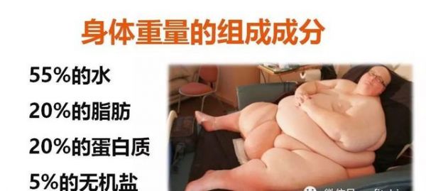 我们必须弄清楚一个概念,减肥不等于减重,因为人体的重量,比如一个100斤体重的人,这个100斤怎么来的? 正常情况下55斤左右的水,20斤左右的脂肪,20斤左右的蛋白质,5斤左右的无机盐!