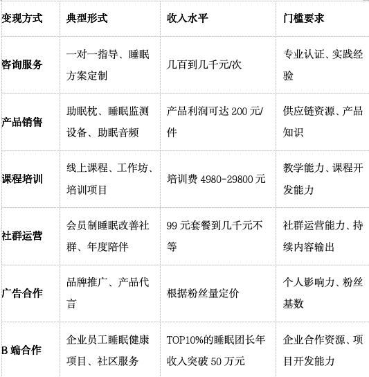 以下是睡眠健康管理师主要的变现方式及其特点,供你参考: