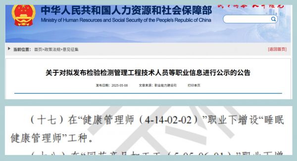 人力资源和社会保障部关于拟发布的新职业、新工种及拟调整变更的职业(工种)的公告。其中,拟在“健康管理师”项下新增“睡眠健康管理师”新工种。