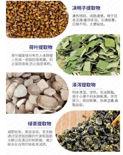 荷叶提取物:现代研究表明其含有的生物碱类成分,有助于促进脂质代谢,减少脂肪蓄积。