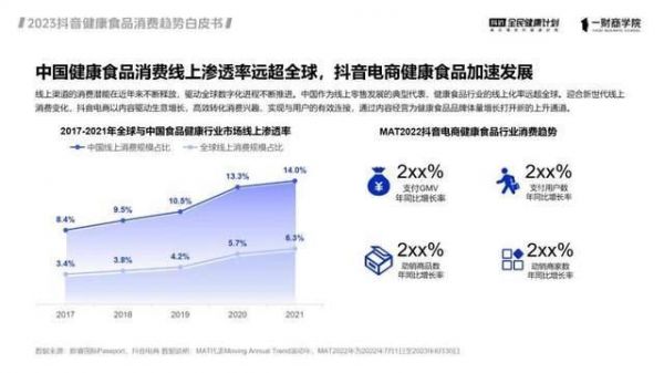 据抖音电商与一财商学院联合发布的《食养有方——健康食品消费趋势白皮书》数据,在抖音电商上健康食品消费的支付GMV、用户数和动销商品数,年同比增长率均超过200%(2022年7月1日至2023年6月30日)。
