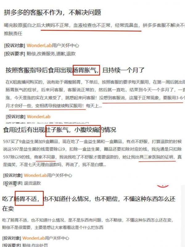 无独有偶, WonderLab旗下益生菌产品也有诸多消费者反映服用之后腹泻到“怀疑人生”,还有的消费者食用在食用WonderLab代餐后出现心慌、腹泻的症状。还有的消费者反映,WonderLab膳食纤维饮料喝胶原蛋白产品喝后出现腹痛现象,大姨妈不正常、血液检查也不正常,经常流鼻血。