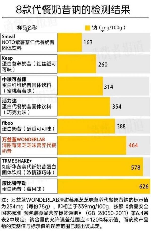 另值得注意的是,万益蓝的相关产品还被检出不符合标准。近期,《消费者报道》向第三方权威检测机构送检了8款代餐奶昔,其中万益蓝WONDERLAB清甜莓果芝芝味营养代餐奶昔钠的实测值与标示值的误差范围超过标准规定。