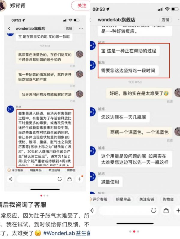 据消费者晒出的沟通截图,对于出现不良反应的反馈,WonderLab客服表示“益生菌与有害菌开始斗争”“属于正常现象,要坚持吃一段时间”,并未给出科学的解释。