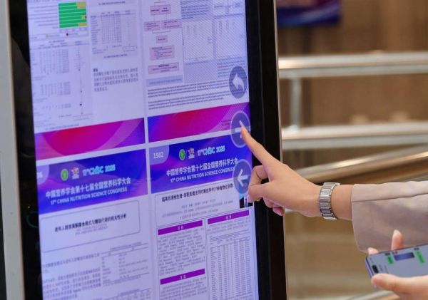 9月22日,参会人员浏览关于营养健康的学术论文。(中国营养学会供图)