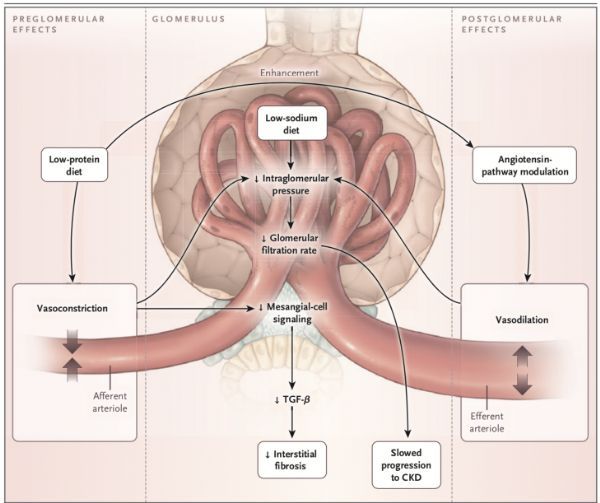 多项研究已经证明,持续的LPD已被用于减少肾小球损伤、稳定CKD病情及改善肾功能。据一篇Denis Fouque教授2017年发表于《新英格兰医学》杂志上的研究表明[1],低膳食蛋白摄入量会导致入球小动脉的收缩、降低肾小球内压,进而减轻肾小球系膜细胞(M)的信号传导,导致转化生长因子β(TGF-β)表达的降低,最终减少间质纤维化。同时实验已经证明,LPD与低钠饮食可以相互协同,减少肾小球内压、肾小球滤过率(GFR)和肾小球损伤。相反,高蛋白饮食可扩张入球小动脉并提高肾小球内压,导致GFR短时间内增加,最终刺激肾小球系膜细胞(M)信号传导,导致TGF-β释放增加,进而推助纤维化和肾脏损害。