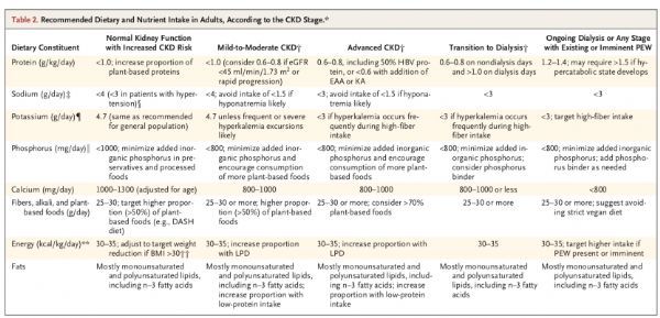 那么在CKD疾病的不同阶段,我们应采用什么样的饮食策略呢?Denis Fouque教授同样在这篇文章中给出了解答,对于晚期CKD或透析前的患者,宜进行LPD,对于此类患者,理想的蛋白摄入量为0.4-0.6g/kg体重/天;对于晚期CKD、透析前或透析中的患者,钠摄入量应低于3g/天,但不应低于1.5g/天;同样,晚期CKD、透析前或透析中的患者对于钾的摄入量也应降低。