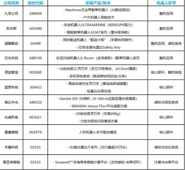 除上述企业之外,据智通财经APP不完全统计,仍有超10家与机器人产业相关的上市公司参与此次展会,该等企业不仅覆盖了整机应用,还囊括了关节模组、激光雷达、灵巧手、3D视觉、计算平台等多个产业环节。
