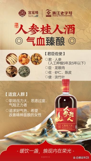 人参桂人酒,汤色紫红、气味芬芳。柔和且醇厚的质地,如同春日里最轻柔的微风,缓缓拂过味蕾。龙眼的甘甜率先在舌尖散开,带着自然的果香,甘甜醇香。人参的独特韵味带来一丝淡淡的药香,为口感增添了几分深邃与层次。陈皮的加入为整体口感注入了清新的果香与微微的酸涩,使口感更加平衡,回味悠长。适合追求好气色的女性。