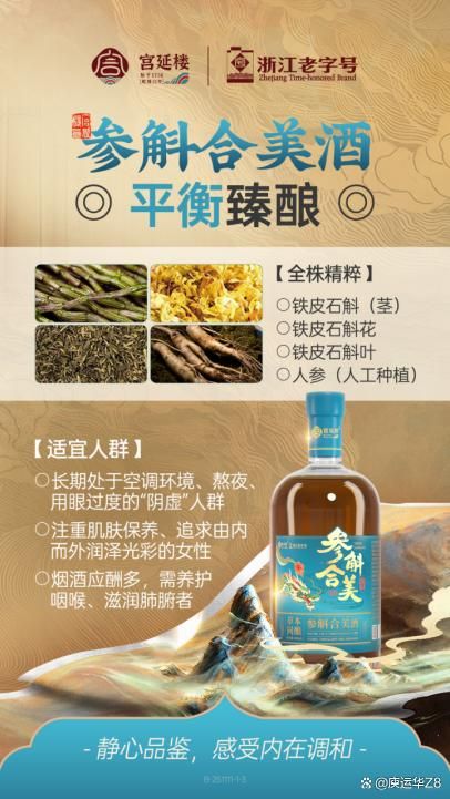 作为百年老字号,宫延楼益福隆承载着百年酿造历史。如今,宫延楼传承古法,将现代新理念、新技术融入酿造,让经典与创新相融合,为消费者提供饱含东方智慧的养生酒。宫延楼养生黄酒系列甄选药食同源的道地草本,采用"本草共酿"核心酿造技艺,将本草与酒醅同步发酵,而非传统物理浸泡。在微生物作用下,草本精华充分析出,与酒体深度交融,成就口感圆润醇和、适合更多群体的养生美酒。