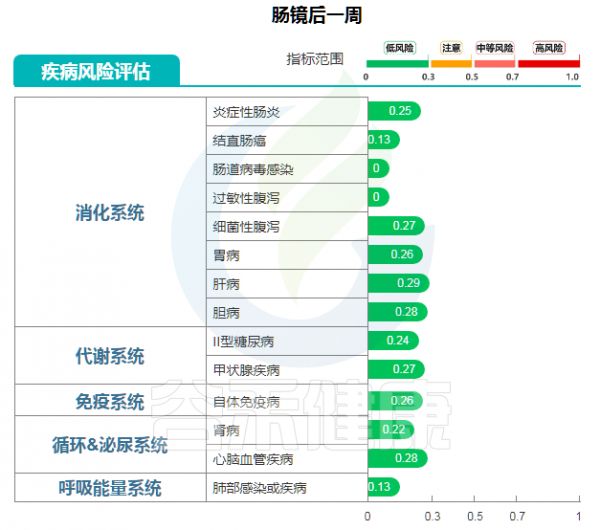 图中可以明显看到,肠镜后一周恢复健康,结直肠癌风险值为0.13,风险很低,也未见肠炎等消化道疾病风险。