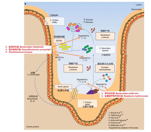 1、主要恢复菌首先利用黏蛋白多糖在肠粘膜中定植,部分可以通过降解复杂碳水化合物利用能量(如单形拟杆菌)