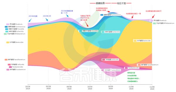 下图是基于小杨 2019-2020年不同时间点取样的肠道菌群结果变化图(“河流”图),从图中我们可以看到肠镜检查对肠道菌群产生的影响。