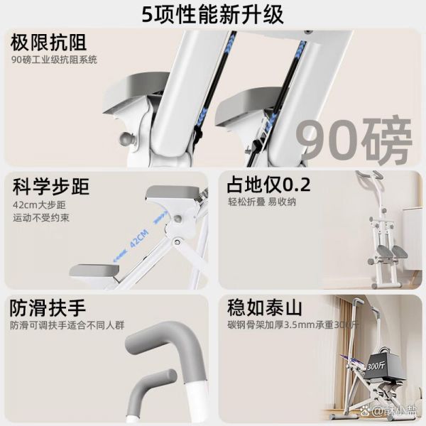 这款设备采用高碳钢玄武架构造,整体框架结实耐用,能够承受高达300斤的重量,大幅提升了使用过程中的稳定表现。双承重绳使用钢丝绳设计,在高强度训练中不易拉伸变形,配合首创的双弹力绳系统,可提供最高120磅的阻力输出,满足进阶燃脂需求。45°斜坡训练模式模拟真实爬楼步态,让动作更自然流畅。占地面积仅0.06平方米,折叠后节省85%空间,非常适合小户型家庭日常锻炼使用。