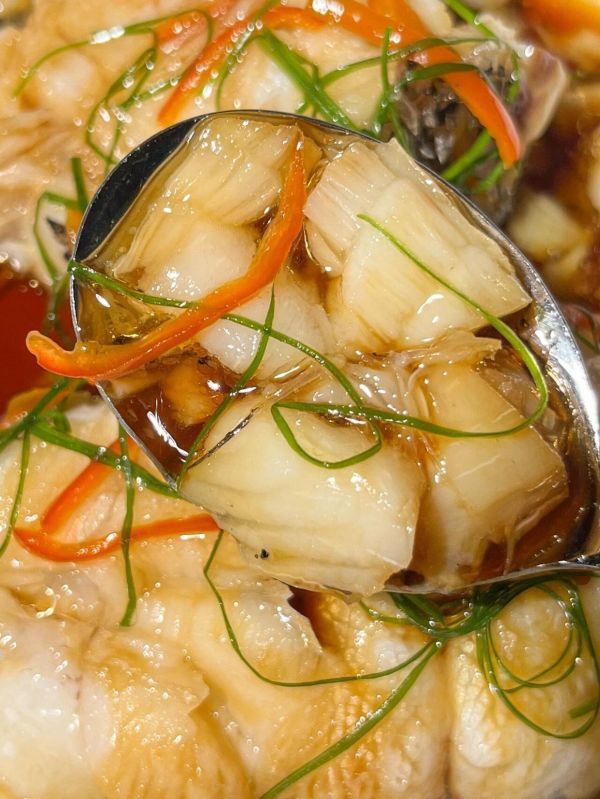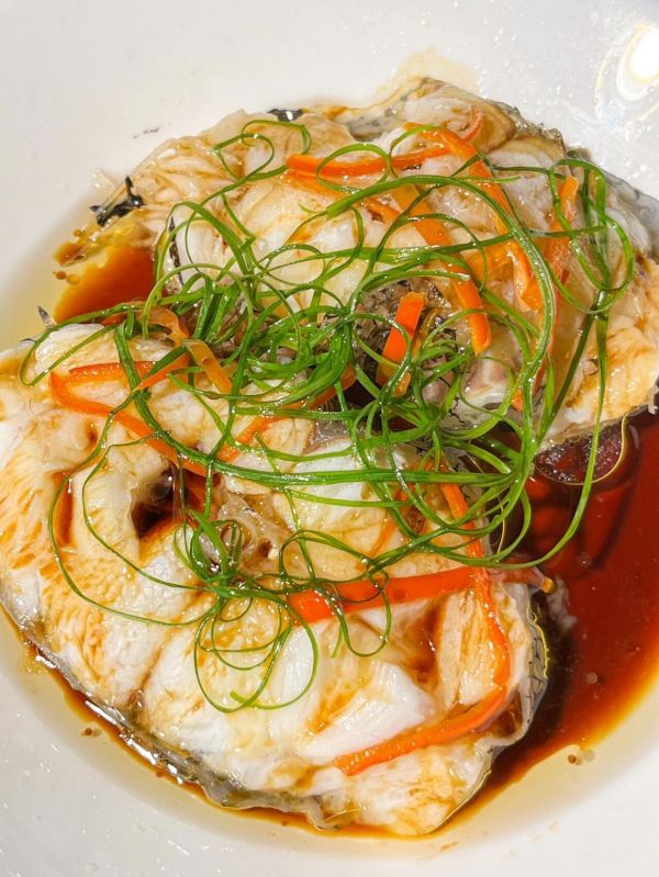 取出后倒掉盘中汁水,淋上蒸鱼豉油,放上时蔬,淋热油激发香味。
