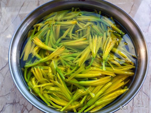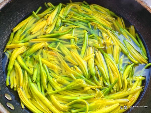 3.然后,把焯水后的鲜黄花菜,用清水充分浸泡,浸泡时间最好在2个小时以上,期间可多换几次水,这样能最大程度地去除秋水仙碱。经过这样处理后的鲜黄花菜,食用起来才较为安全。