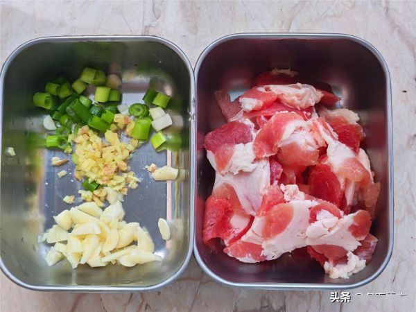 4.把猪肉切成薄片,放入碗中,葱切葱花、姜切末、蒜切成小片备用。