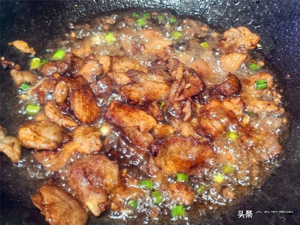 5.锅内加入油,油热后放入肉片煸炒至变色,把五花肉炒出油,待肉片微微卷曲,表面金黄时,放入葱、姜、蒜片爆香,闻到浓郁的香味。