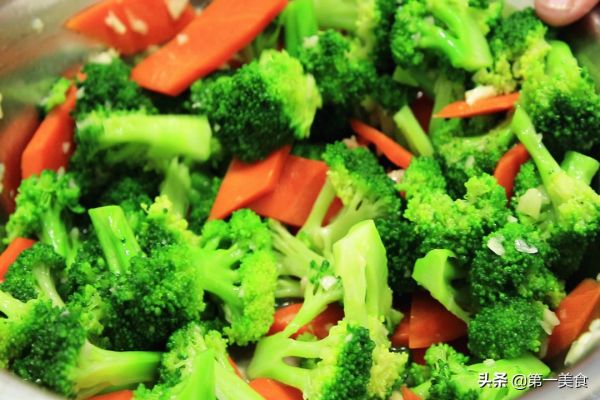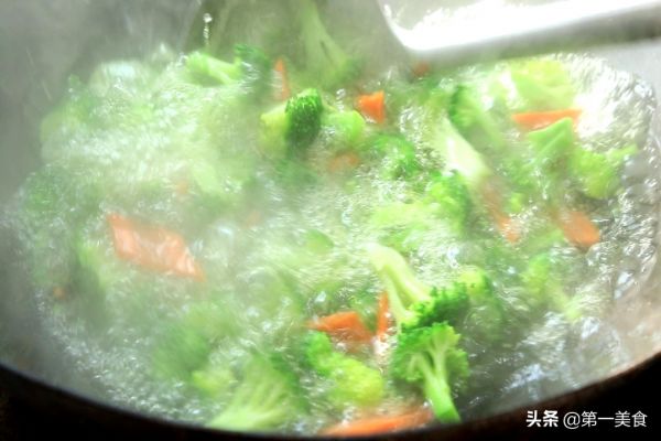 4.锅内烧水,加入一勺食盐增加底味,淋入少许植物油锁住营养,几乎所有的绿叶青菜,焯水时都少不了食盐和植物油。水开以后把西兰花倒入锅中,快速焯烫至开锅倒入胡萝卜一块汆水,整个过程不要超过20秒钟,不然西兰花容易发黄。