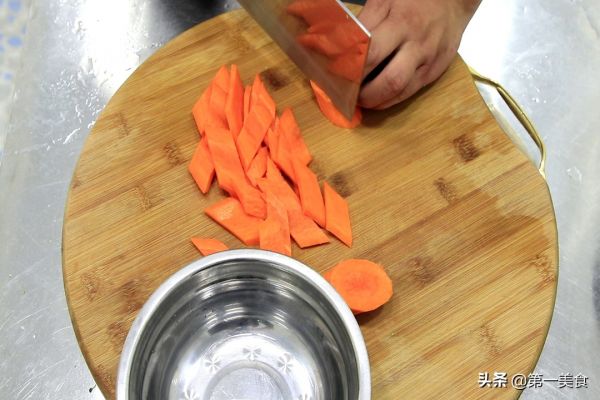 2.胡萝卜削去外皮,切成菱形片。