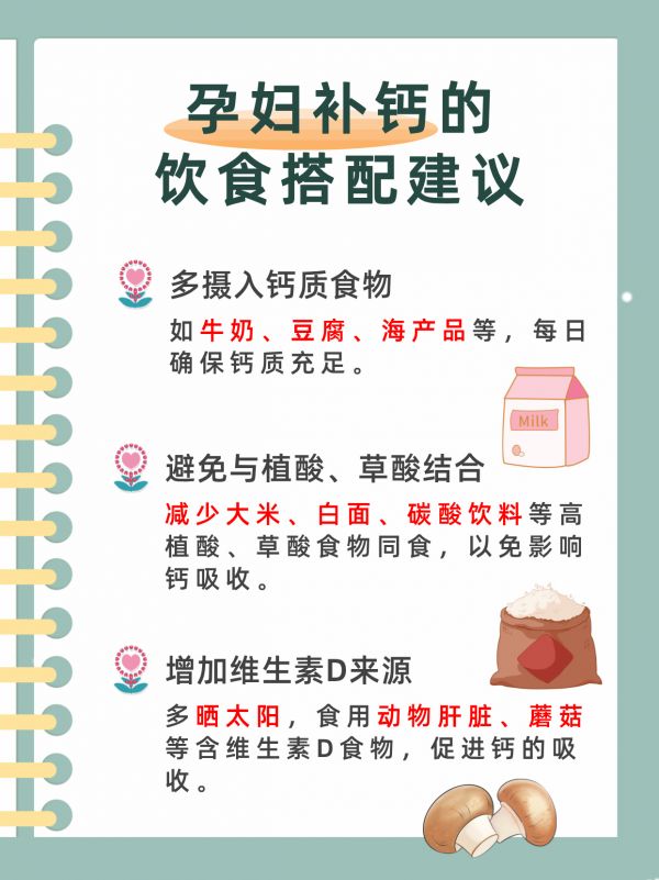 3、饮食搭配:孕妇在补钙的同时,也要注意其他营养素的摄入,如维生素D、镁等,这些营养素有助于钙质的吸收和利用。