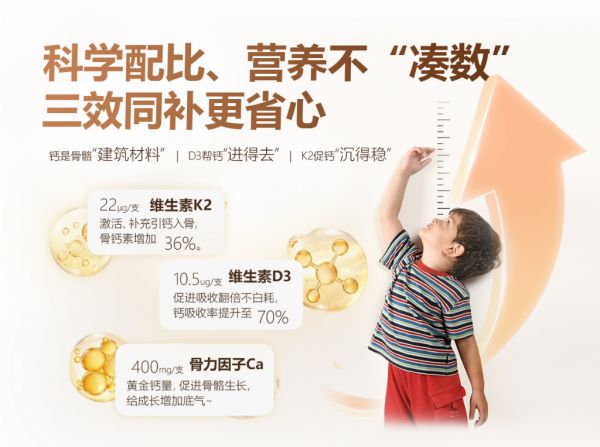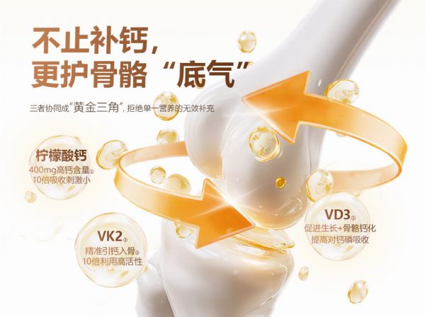 2.重点关注“柠檬酸钙+维生素D3+维生素K2”三重协同体系,优选专利原料、全反式K2(MK-7型)、专利D3及高吸收有机钙,搭配赖氨酸、镁锌等协作辅助,科学生物利用度全程严控。