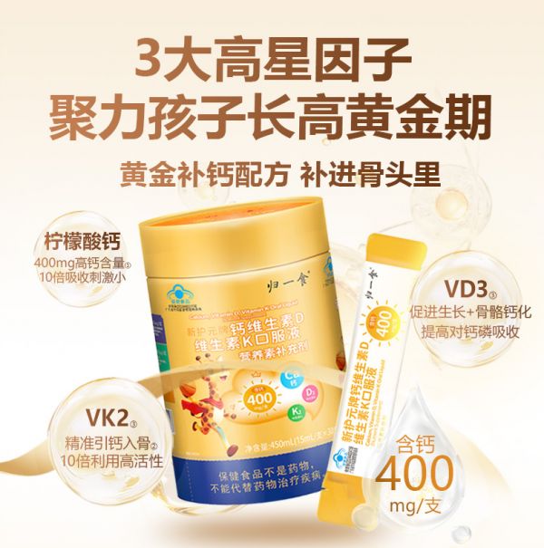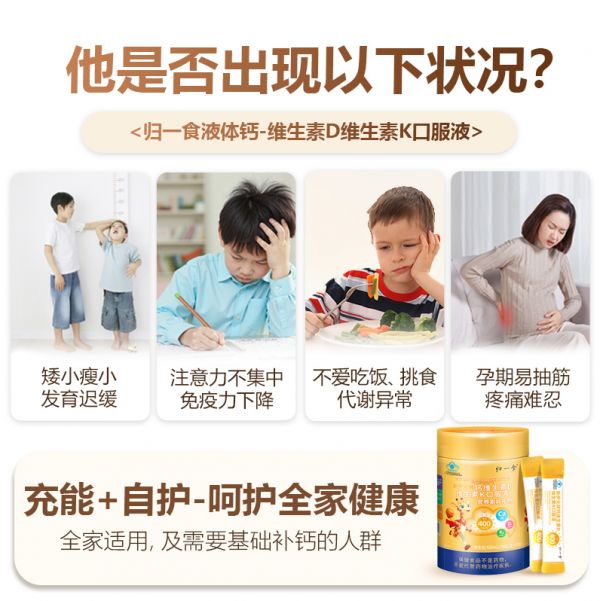 3.孩子偏食、发育慢、依从性差,建议选择归一食液体钙,清新甜橙口味,独立条装按需管理,改善食欲难题。