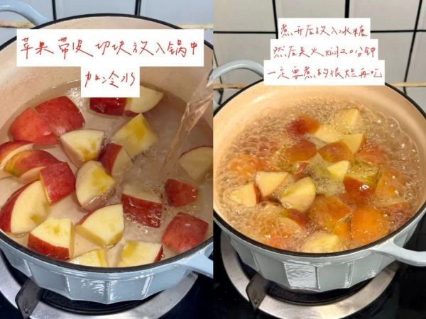【做法】苹果洗净,带皮切块,放入锅中,加冷水;煮开后放入冰糖,小火再煮个五分钟,关火焖20分钟,一定要将苹果焖到软软的状态再吃。