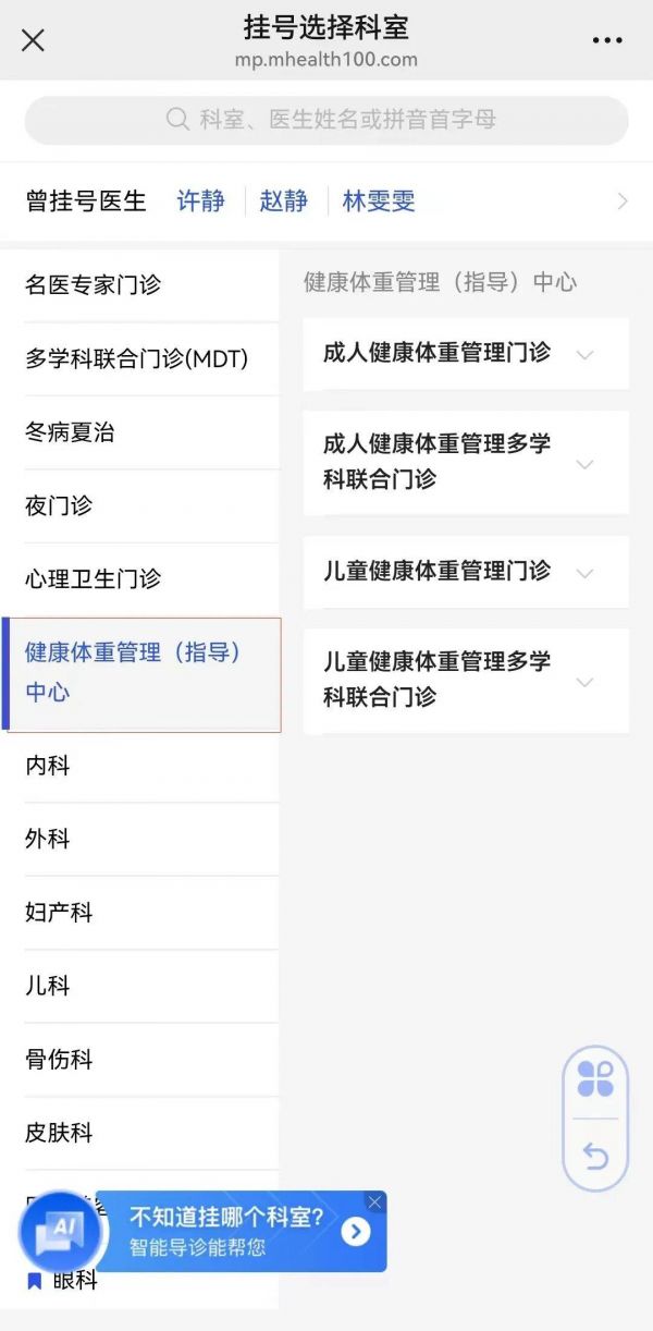 点击【健康体重管理(指导)中心】,选择医生及就诊时段,完成预约。