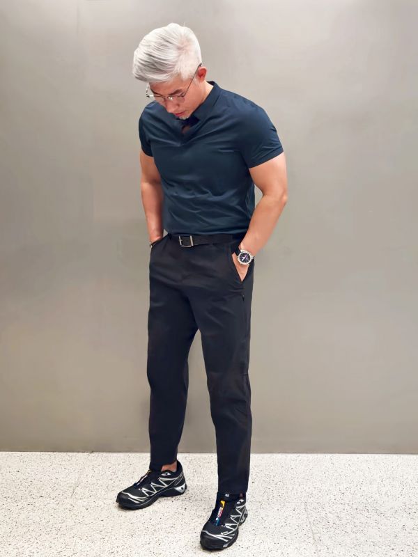 比如,POLO衫+西裤+萨洛蒙运动鞋,兼顾正式与休闲感,呈现出来的造型不扮嫩不老气,贴合中年男人年龄气质,赢得不费力的高级。