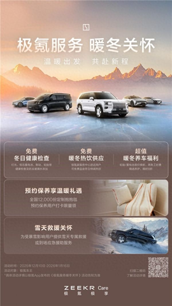 随着冬季来临,极氪正式启动"温暖出发 共赴新程"服务关怀活动,自2025年12月10日起至2026年1月16日,针对冬季用车特性与车主需求,推出覆盖车辆维护、驾乘舒适、专属礼遇、养护支持及应急保障五大维度的全面服务方案。本次暖冬活动旨在通过专业化、精细化、人性化的服务措施,为极氪车主构建全方位的冬季用车保障体系。