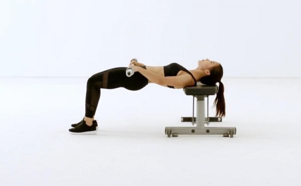 弯曲双腿和膝盖,将肩膀(斜方肌和三角肌后束)放在椅子上,将杠铃放在臀部的髋部,使用双手握住杠铃,双手保持在稍微比髋部宽的状态。当下降到低点时,不能使臀部接触到地面,要保持臀部的悬空状态,然后将臀部向上推,直到到达初始位置。下降时吸气,顶起臀部时吸气,感觉到臀部会有酸胀感;注意,当你到达最低点时,你的臀部不能接触到地面。当你起身时,你应该用你的臀部撑起。静态臀桥