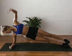 双臂屈肘位于肩部下方,双腿向后伸直并拢,脚尖踩地,挺直背部收紧核心,臀部向一侧转体然后再转向另一侧,建议每组做20次。