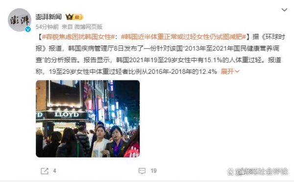 这一数据背后反映的是深层的社会与文化问题。在韩国,流行文化和社交媒体的影响力日益增强,对女性美的标准也随之变得更为严苛。从流行偶像到日常生活,一种极端瘦削的身体形象被高度推崇和模仿。在这样的文化氛围下,即便体重正常或过轻的女性也难以逃脱内心的焦虑,她们在社会的潜在期待和自我认知之间挣扎。