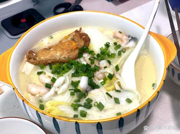 3、鱼汤过漏网漏掉所有渣子,放入切成块的嫩豆腐煮开5分钟左右,加适量盐(尝味调整)和白胡椒依次加入虾,煎蛋,娃娃菜,最后加入黑鱼片涮熟即可,提前煮好过凉水的面条,加入锅内即可!