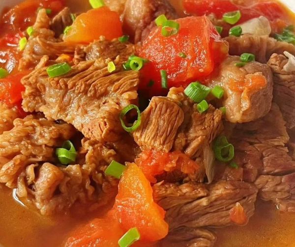 做法:牛腩焯水后切块,西红柿去皮切丁。锅中炒香洋葱和番茄,加牛腩和清水炖1.5小时,出锅前调味。
