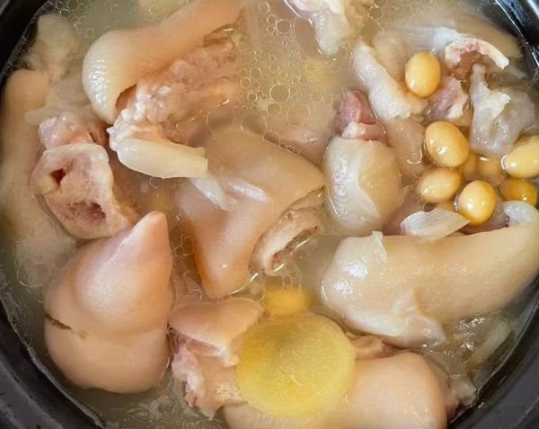 做法:黄豆提前泡发,猪蹄焯水后切块,和黄豆、姜片一起炖1.5小时,最后调味。
