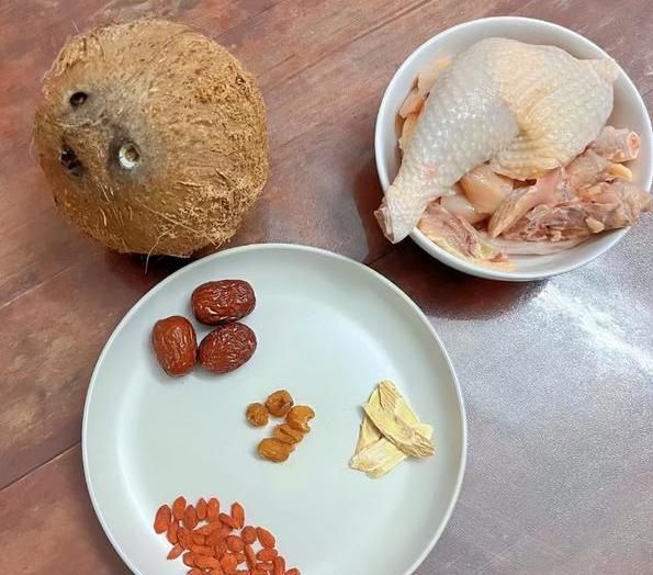 首先,需要准备的食材有:一个新鲜的海南椰子、约20克干桂圆肉、适量的红枣或蜜枣、30克的党参、一只老母鸡、一块姜、少量料酒、约25克的枸杞子、适量冷水和温水、适量食盐、半根大葱、少许胡椒粉和其他调味品。