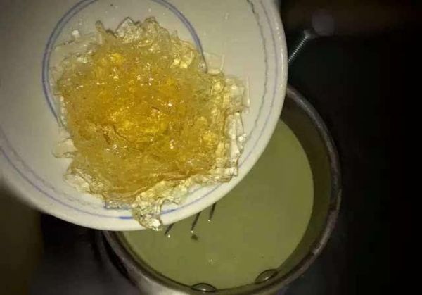 待葡萄凉粉在室温下自然晾凉后,盖上保鲜膜,放入冰箱冷藏一个小时以增加口感。冷却后可直接食用或脱模,建议淋上蜂蜜增添风味。 从冰箱中取出后,若选择脱模,也可以淋上蜂蜜,即刻品尝!