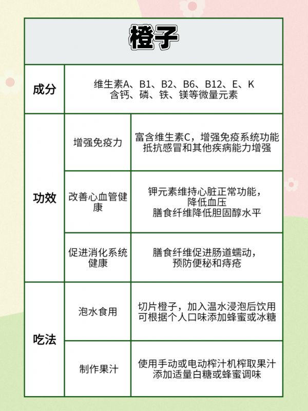 3、促进消化系统健康:橙子中的膳食纤维可以促进肠道蠕动,预防便秘和痔疮。坚持食用一个月,你可能会发现肠胃功能得到明显改善。