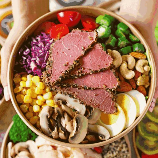 很多人觉得只吃沙拉吃不饱,但只要添加鸡胸肉、牛排块,一样可以吃得很饱足健康。书中以酪梨牛排沙拉为例,先把牛排用盐和胡椒醃过煎熟,加上番茄丁、洋葱、玉米、罗曼、莴苣、酪梨,配上柠檬汁和优格组成的酪梨沙拉酱,吃起来味道丰富、多层次,既能摄取到足够的蛋白质,还能摄取纤维质。