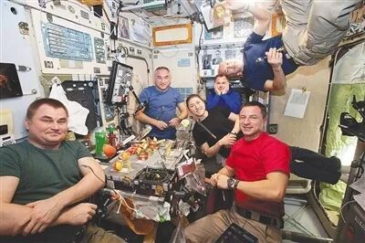 国际空间站内宇航员在聚餐