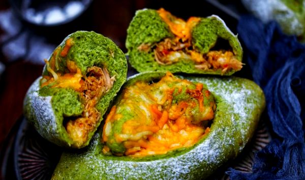 高筋面粉250克、菠菜汁(由120克菠菜和100克水混合而成)、清水100克、砂糖15克、盐2克、酵母2.5克、黄油15克。另外,还需准备辣味金枪鱼罐头1个以及适量混合芝士作为馅料。