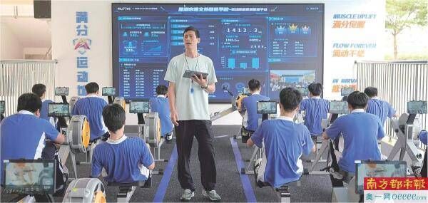 “满分AI运动馆”,体育老师利用运动健康数据管理平台上课。