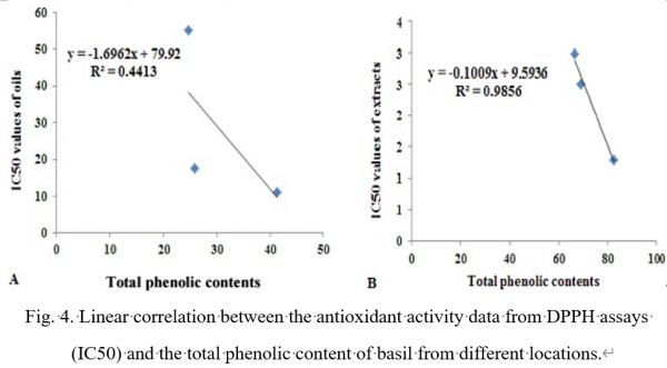 本研究从埃及的3个产区(埃及的艾斯尤特、米尼亚和贝尼苏夫)提取罗勒挥发油,进行化学成分存在差异研究。罗勒提取物中总酚类物质含量较高,对DPPH自由基的清除能力强于精油。结果表明,罗勒提取物的抗氧化活性与总酚类物质含量呈显著正相关。精油的自由基清除活性变化较大。相反,不同产地罗勒精油的抗氧化活性与总酚类含量相关性较低。本研究结果显示,埃及罗勒精油及提取物的抗氧化活性存在显著差异,值得进一步研究。